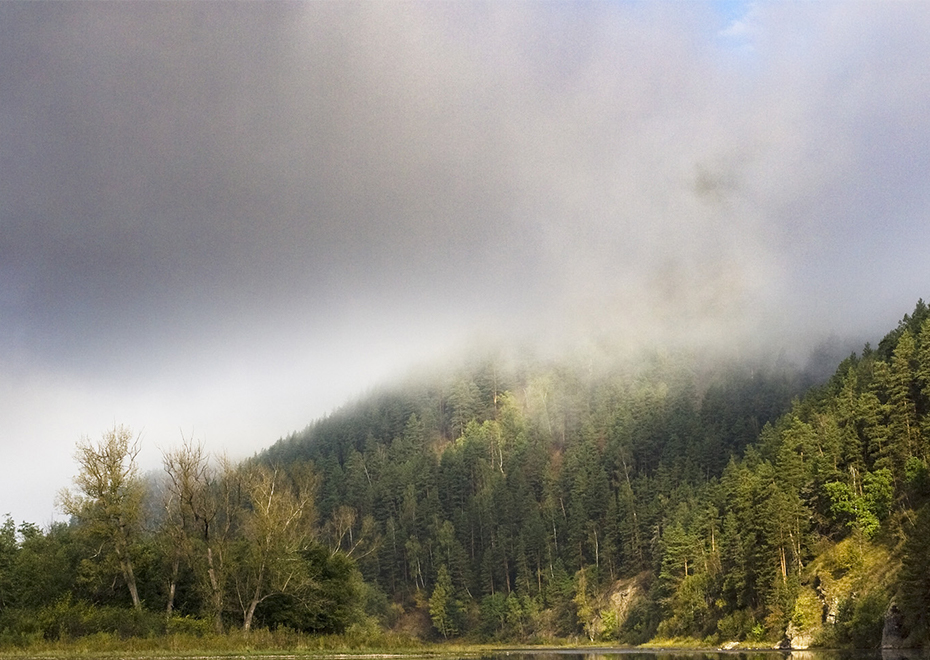 Плачущая скала. Безымянная скала на правом берегу. По черным отрогам, со скал летит ручеек, разбиваясь на мелкие ручейки на скале, далее летит несколько метров уже свободно в реку.