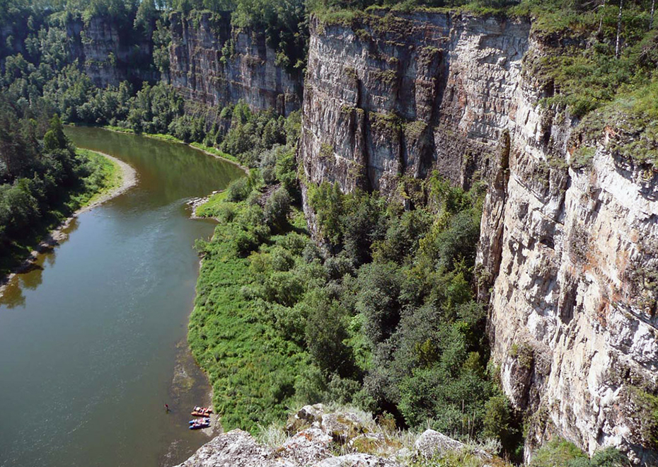 Скала Большие Притесы. Колоссальная скальная стена высотой до 96 метров и длиной 2 километра. Посреди скалы на высоте 60 метров чернеет вход в грот Юношеский.